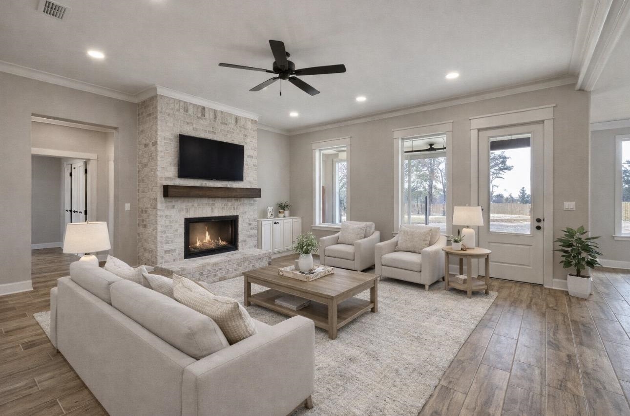 | PRICE DROP!! Welcome to 195 Clara Ln located in Sabine ISD in the popular and growing Cedar Ridge subdivision! This brand new construction home completed in 2026 offers a spacious open concept design that seamlessly connects the living room kitchen and dining area! The living room features a cozy wood burning fireplace creating a warm and inviting space for relaxing or entertaining! Full of natural light, and tall ceilings found throughout! The kitchen is beautifully designed with a massive island, under cabinet lighting, abundant storage, stainless steel appliances, a stunning backsplash and an oversized dining area! A large walk in pantry adds both convenience and functionality making this kitchen perfect for everyday living and hosting gatherings! Offering four bedrooms and two full bathrooms! Three guest bedrooms and a full guest bathroom are thoughtfully located on one side of the home providing privacy and comfort for family or visitors! The split primary suite offers peaceful views and a private retreat! The primary bathroom features a soaker tub, a separate stand up shower, dual sinks with separate vanities and a massive walk in closet that conveniently connects to the oversized laundry room! Boasting approximately 2,210 square feet of living space and nestled on a generous .61 acre lot this home offers both space and comfort! Beautiful curb appeal and warm accents throughout and subtle touches of country charm make this home truly special! Do not miss the opportunity to own this stunning new construction in one of the area’s most desirable neighborhoods! | |