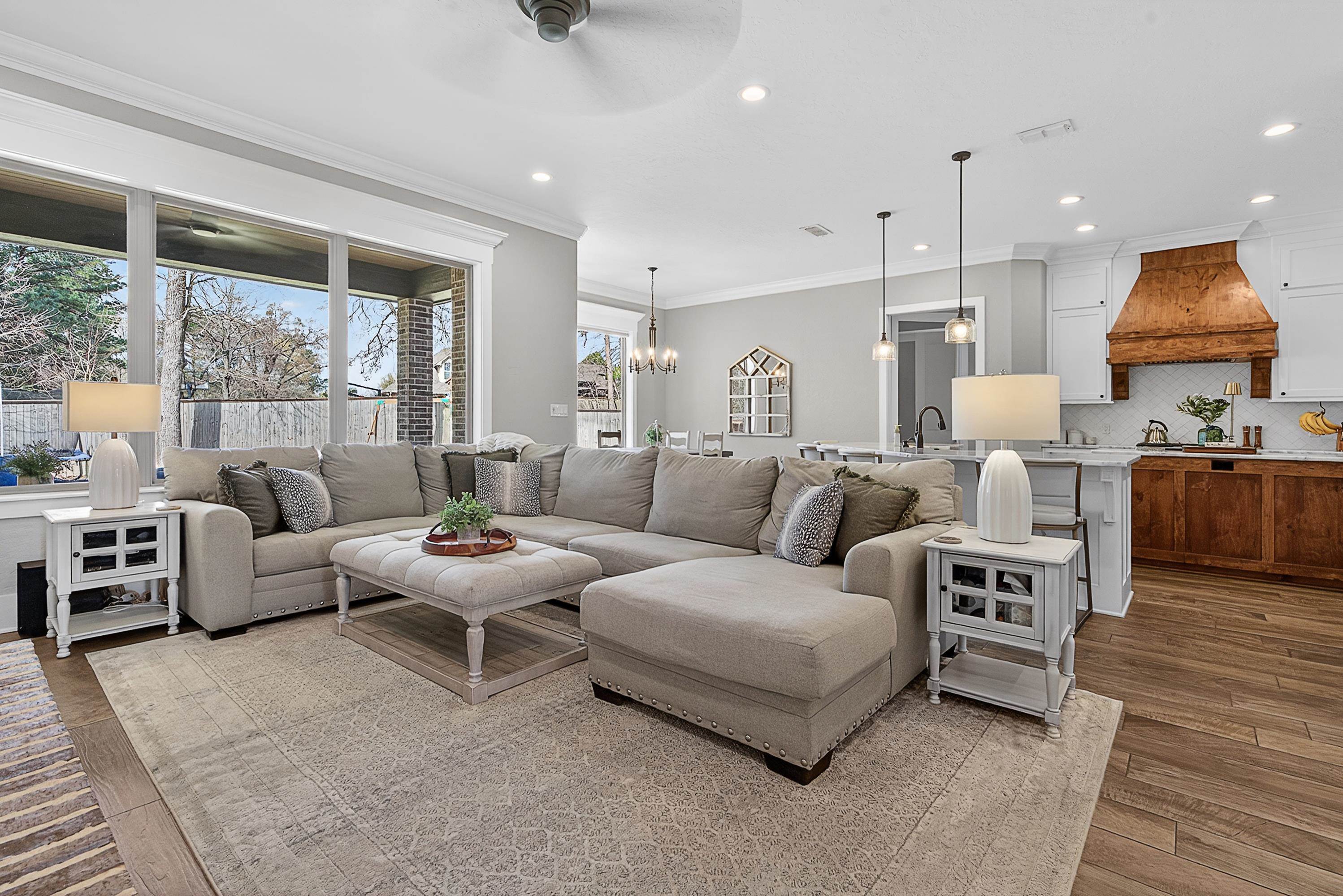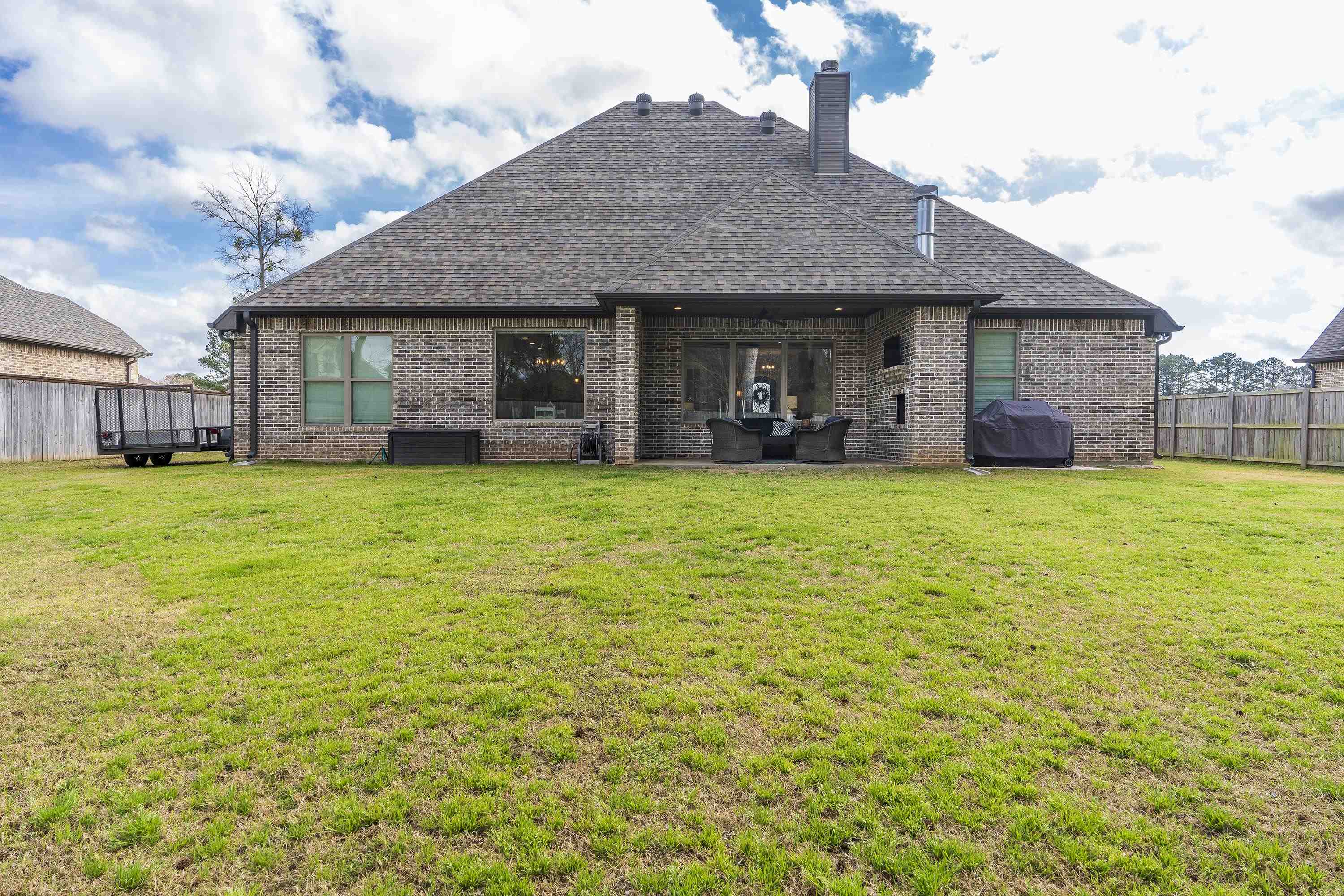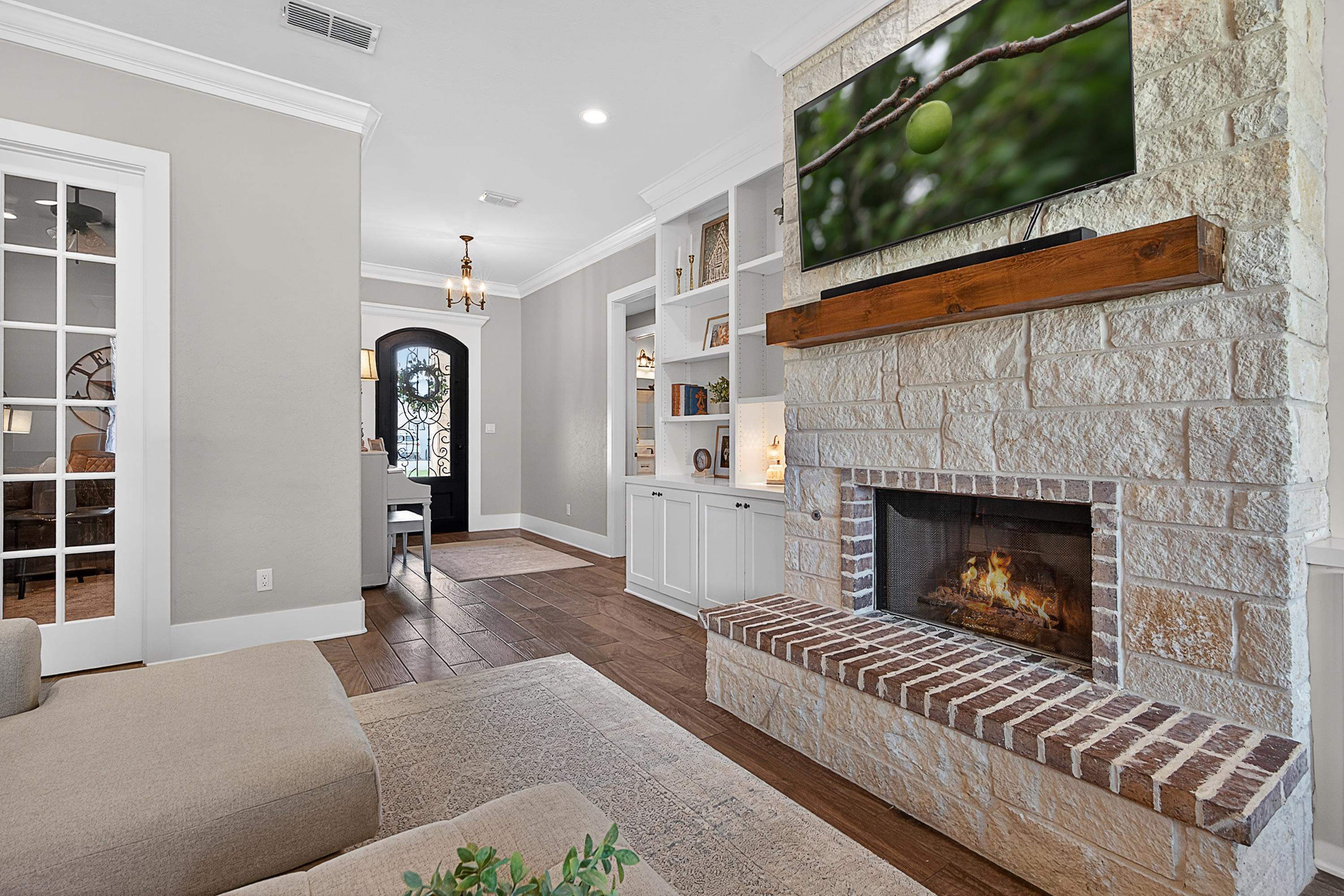 | Situated on an interior lot in Saddle Brook, this pristine traditional is better than new! Flexible floor plan includes four bedrooms and a large study with glass doors for privacy. The study could also be used as a playroom, second living or formal dining. Floor to ceiling built-ins flank the fireplace in the open living space. Large windows across the back of the home pour natural light. The island kitchen is grounded by warm wood tones on the island & hood. Primary suite features a shower and soaking tub. The spacious closet adjoins the laundry room for added convenience. The laundry opens to the mud room area on the other side. Covered patio with fireplace overlooks large fenced yard. Fantastic location in the heart of Hallsville, it's the perfect place to call home. | |
