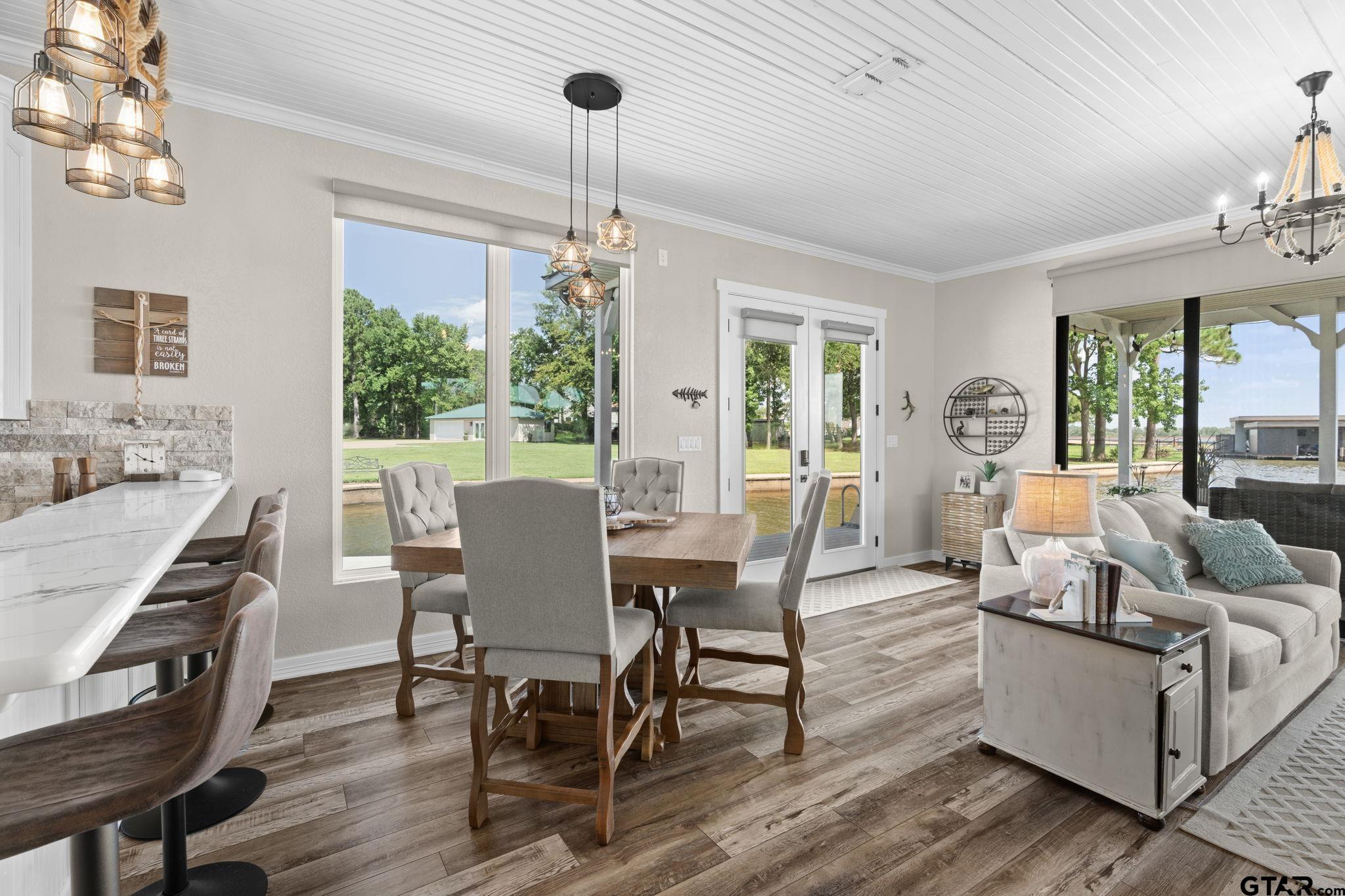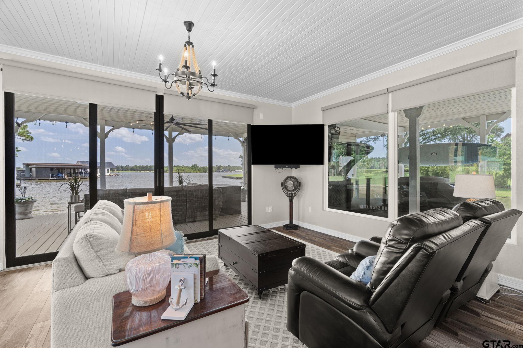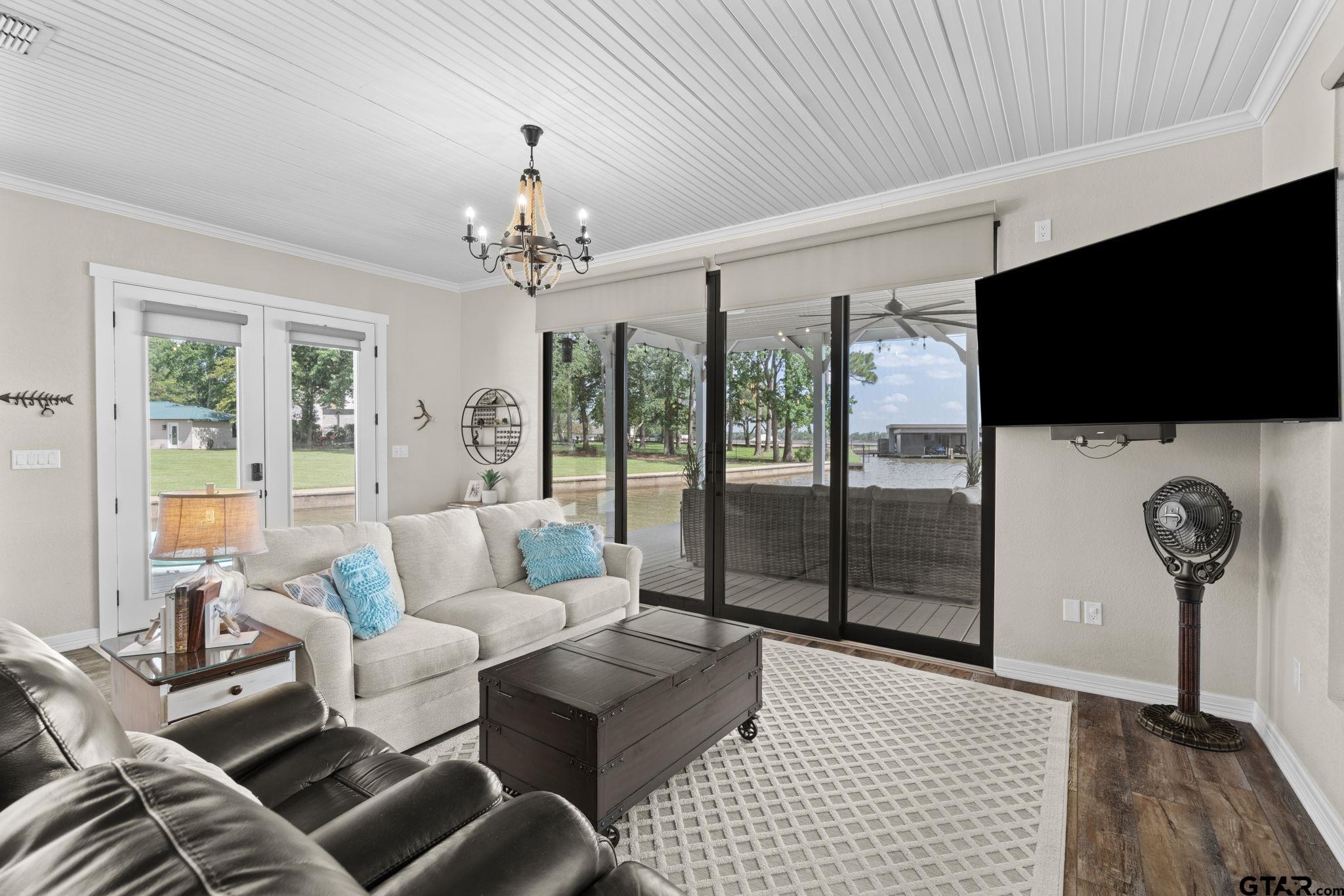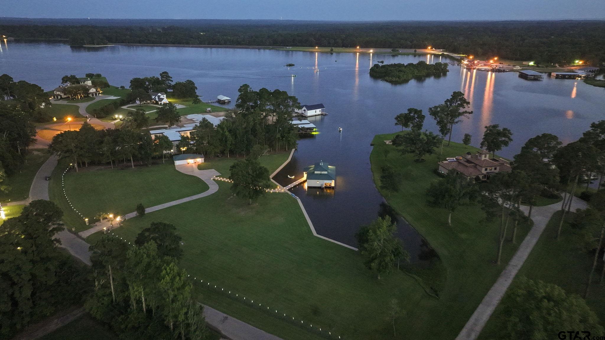 | Lakefront paradise with breathtaking views in every direction. This rare 2+ acre estate offers the perfect blend of privacy, luxury, and potential—move in now, enjoy the guest house, or build the dream home you’ve always envisioned. A wide lot ensures total seclusion, while manicured Zoysia-Bermuda grass and a full smart irrigation system enhance the landscape. Approximately 500 feet of iron fencing with solar lighting, a stately smart-gated entrance, featuring rock columns with hard-wired color-changing smart bulbs that glow at night, and concrete driveways create a polished first impression. A beautifully lit cart path leads you down to the water, where you'll find the impressive boathouse. Approximately 410 feet of concrete bulkhead and sidewalk along the 630 feet of shoreline, nestled in an essentially private cove with expansive open water views. The covered boathouse includes a boat lift and watercraft lift, complete with a Gem remote and garage doors for privacy and wind protection. The main home sits just above the water and features walls of windows with motorized shades, Quartz countertops, durable LVP flooring, and high-end appliances—every detail designed for style and comfort. The detached guest house offers a living and sleeping area, full bathroom with dual sinks, washer and dryer, and a double-car garage—perfect for guests or extra space. Open-air decks invite you to relax and take in the natural beauty, while the property’s location is just minutes from the City of Whitehouse, great dining, and a short paddle board ride to Lake Tyler Marina Resort. Whether you’re looking for a weekend retreat or a future full-time residence, this is lake living at its best. | |