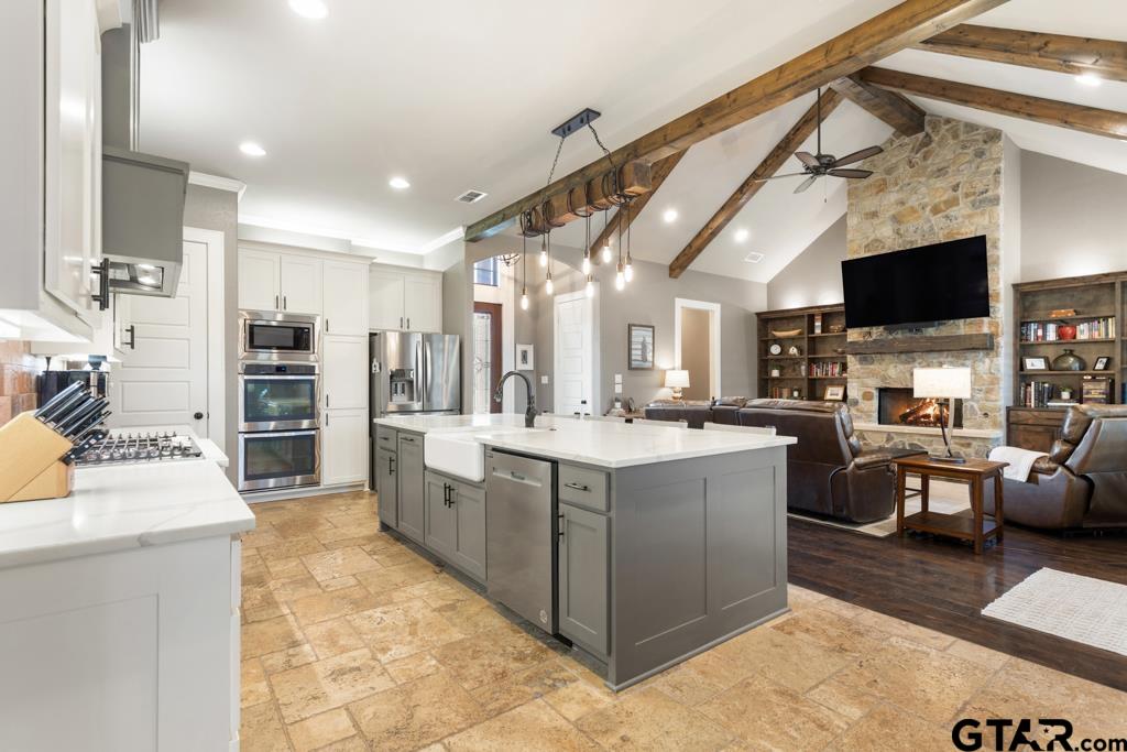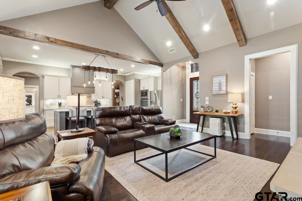 | Located on a desirable corner lot in the sought-after Oak Creek addition, this beautifully designed 4-bedroom, 2.5-bath home offers 2,565 square feet of inviting living space with an open floor plan ideal for everyday living and entertaining. The spacious living room makes a stunning first impression with a floor-to-ceiling stone fireplace, vaulted ceiling, exposed wood beams, and rich wood flooring that adds warmth and character. The open kitchen is built for gathering and functionality, featuring a large center island, double ovens, gas cooktop, abundant counter space, and extensive cabinetry for storage. The private primary suite offers a relaxing retreat with a well-appointed en suite bath including separate vanities, a soaking tub, walk-in shower, and a large walk-in closet with built-ins for excellent organization. Additional highlights include plantation shutters, generous secondary bedrooms, and thoughtful design throughout. Step outside to enjoy the private, landscaped backyard and extended patio—perfect for outdoor dining, entertaining, or simply unwinding. Ideally located just a short walk from Tyler Athletic & Swim Club, this home offers the perfect blend of comfort, style, and convenience in one of South Tyler’s most desirable neighborhoods. | |