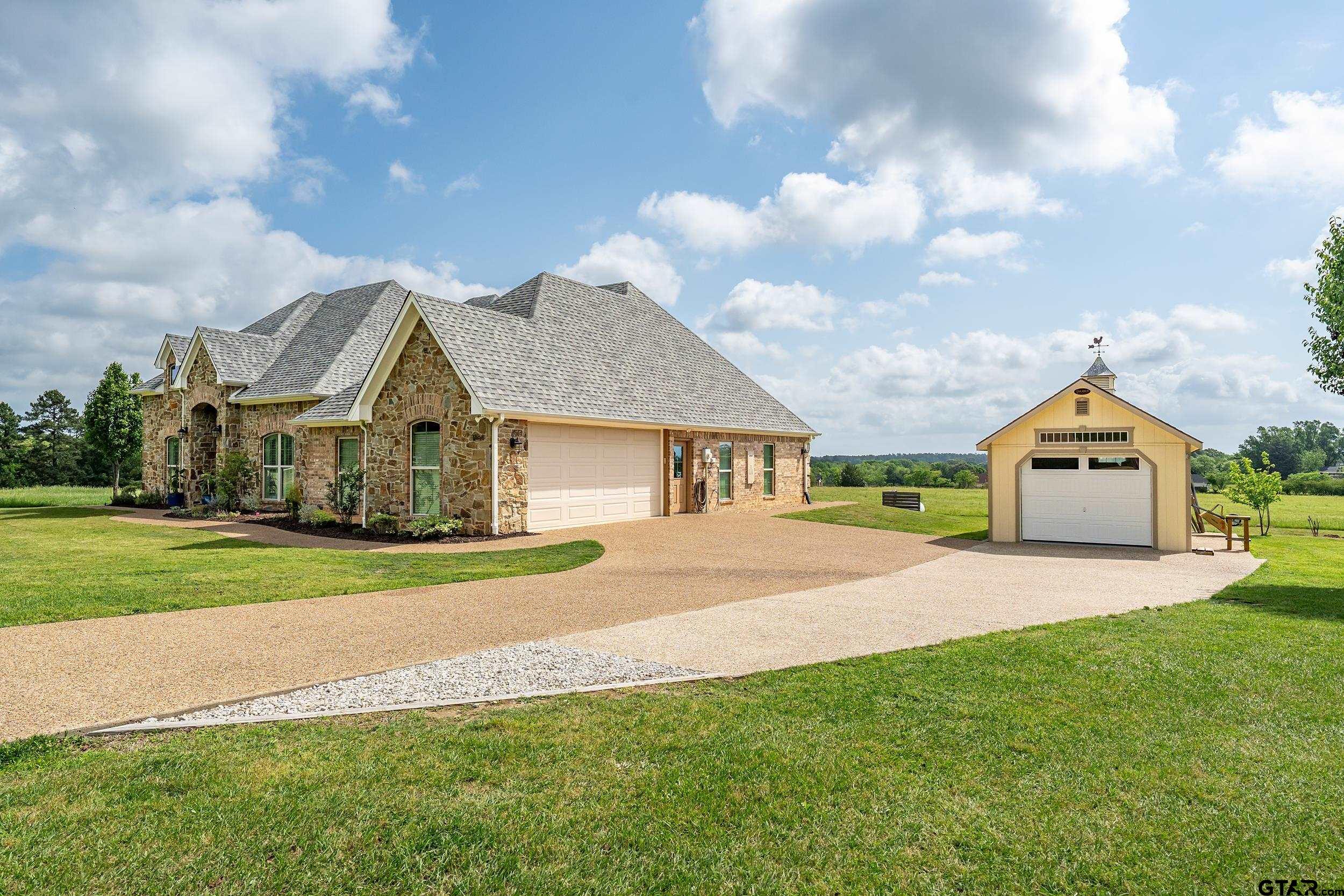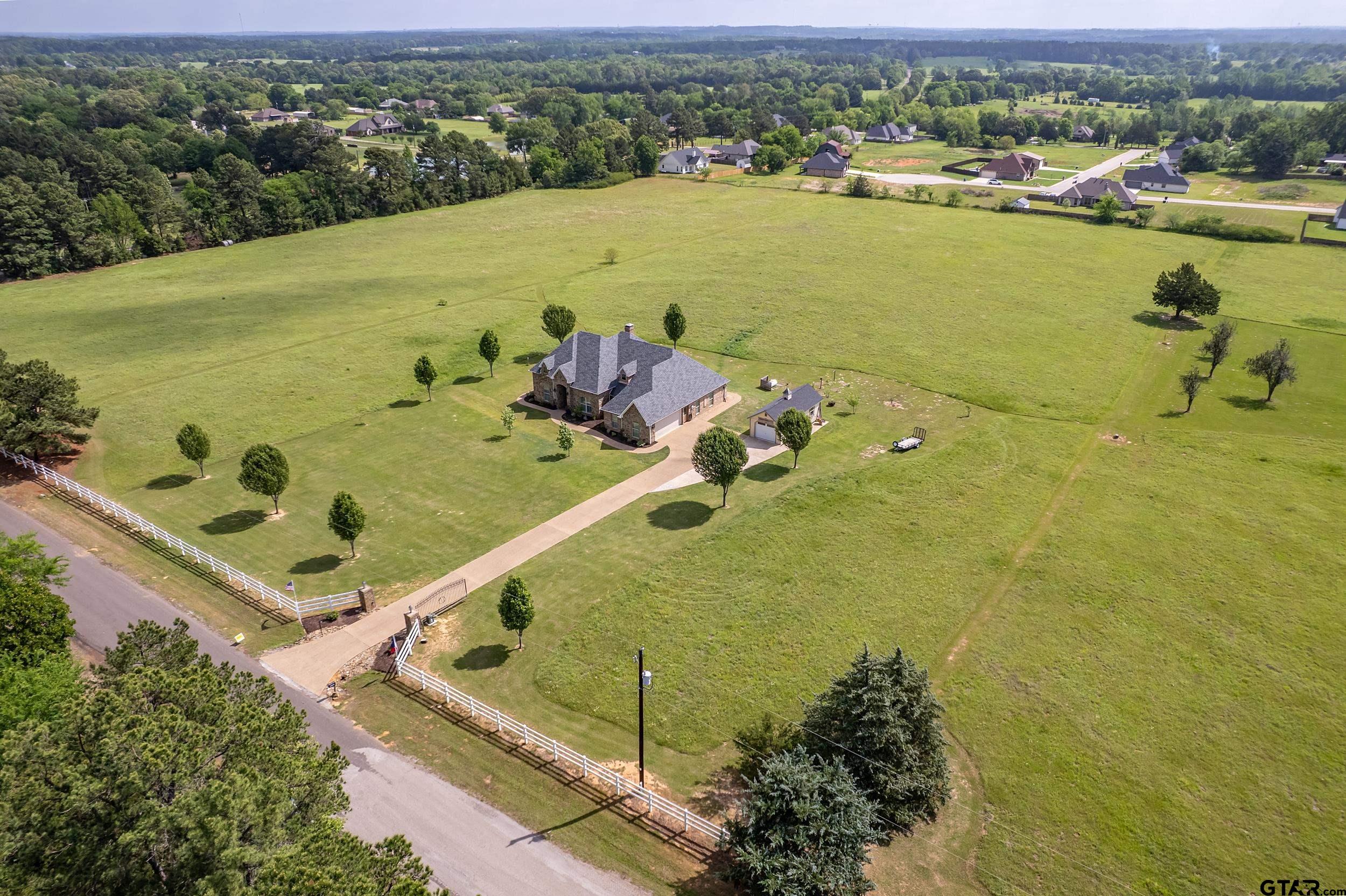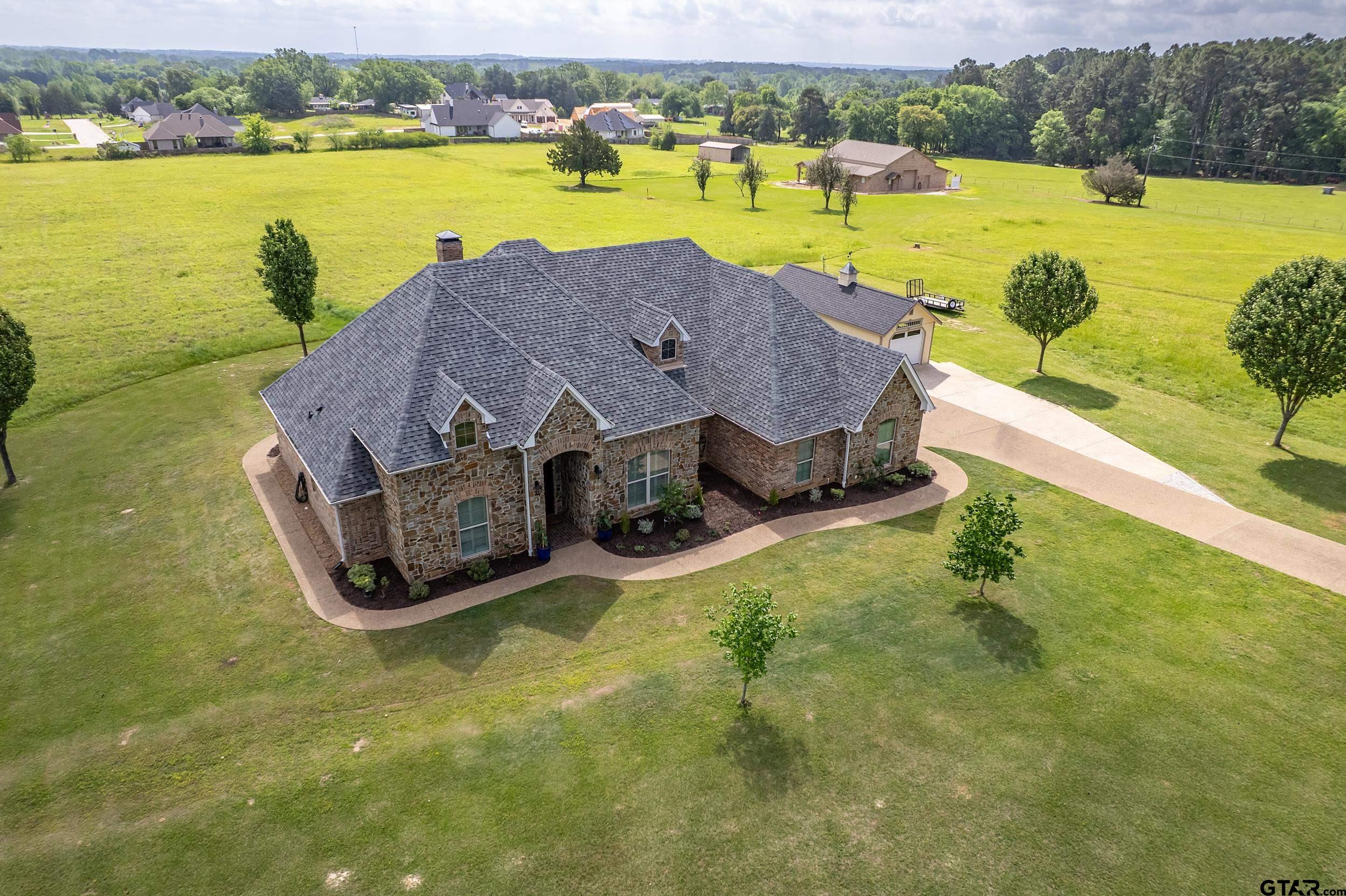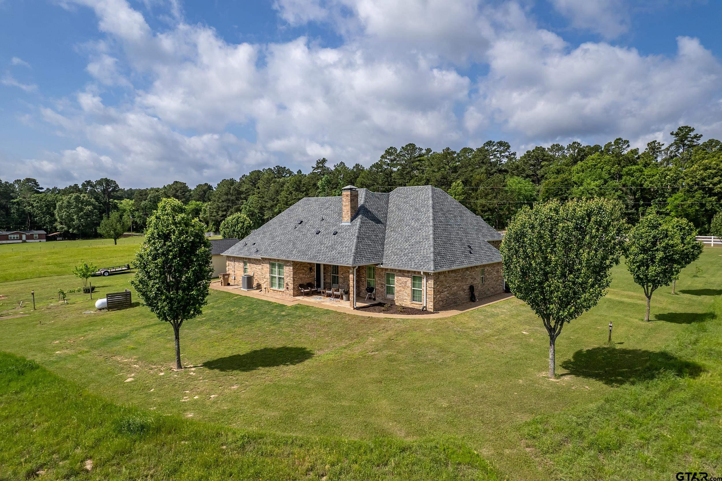 | Immaculate custom home on 6.45 acres in Flint, offering the perfect blend of peaceful country living just minutes from all the conveniences of Tyler. This 3 bedroom, 2 bath home features a 2 car garage plus a shop and versatile flex space, ideal for a second living area, office, or formal dining. Designed with accessibility in mind, the home includes wheelchair accessible doorways and thoughtful layout throughout. Inside, you’ll find gorgeous finishes including travertine floors, tall ceilings, arched doorways, custom trim work, and beautiful ceiling treatments. The inviting family room opens seamlessly to the kitchen and features a gas log fireplace, creating a warm and welcoming atmosphere. The kitchen is well-appointed with granite countertops, island, stainless appliances, pantry, and custom cabinetry, along with plantation shutters on many of the windows. The spacious primary suite offers a double tray ceiling and an ensuite bath with separate vanities, soaking tub, separate shower, water closet, and walk-in closet. Two guest bedrooms share a full, hall bath with double vanity, and storage is abundant throughout. Updates include new interior paint in 2022, new oven 2024, new dishwasher 2026, and new HVAC 2025 (both inside and out.) Additional highlights include a laundry room with sink and built-in desk or coffee bar area, extra concrete for additional parking, security gate, and a welcoming white rail fence with automatic entry. Enjoy the serene setting and beautiful acreage views from the covered back patio, all with no close neighbors for added privacy. Come See! Come Buy! | |