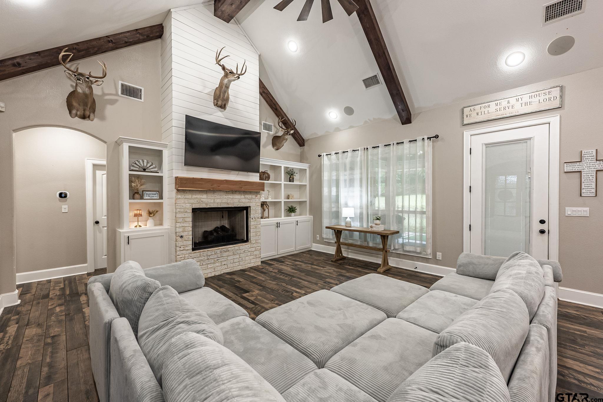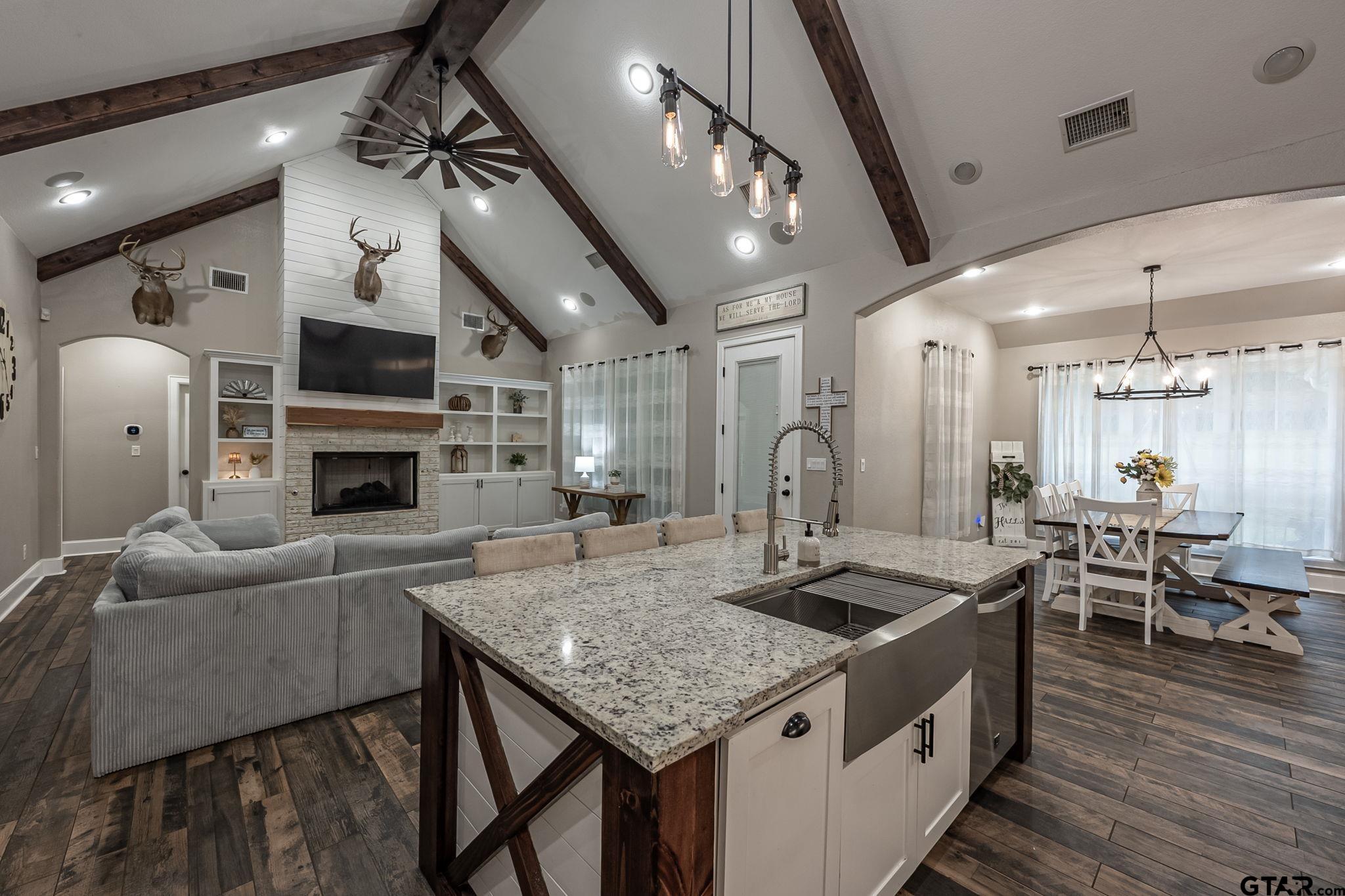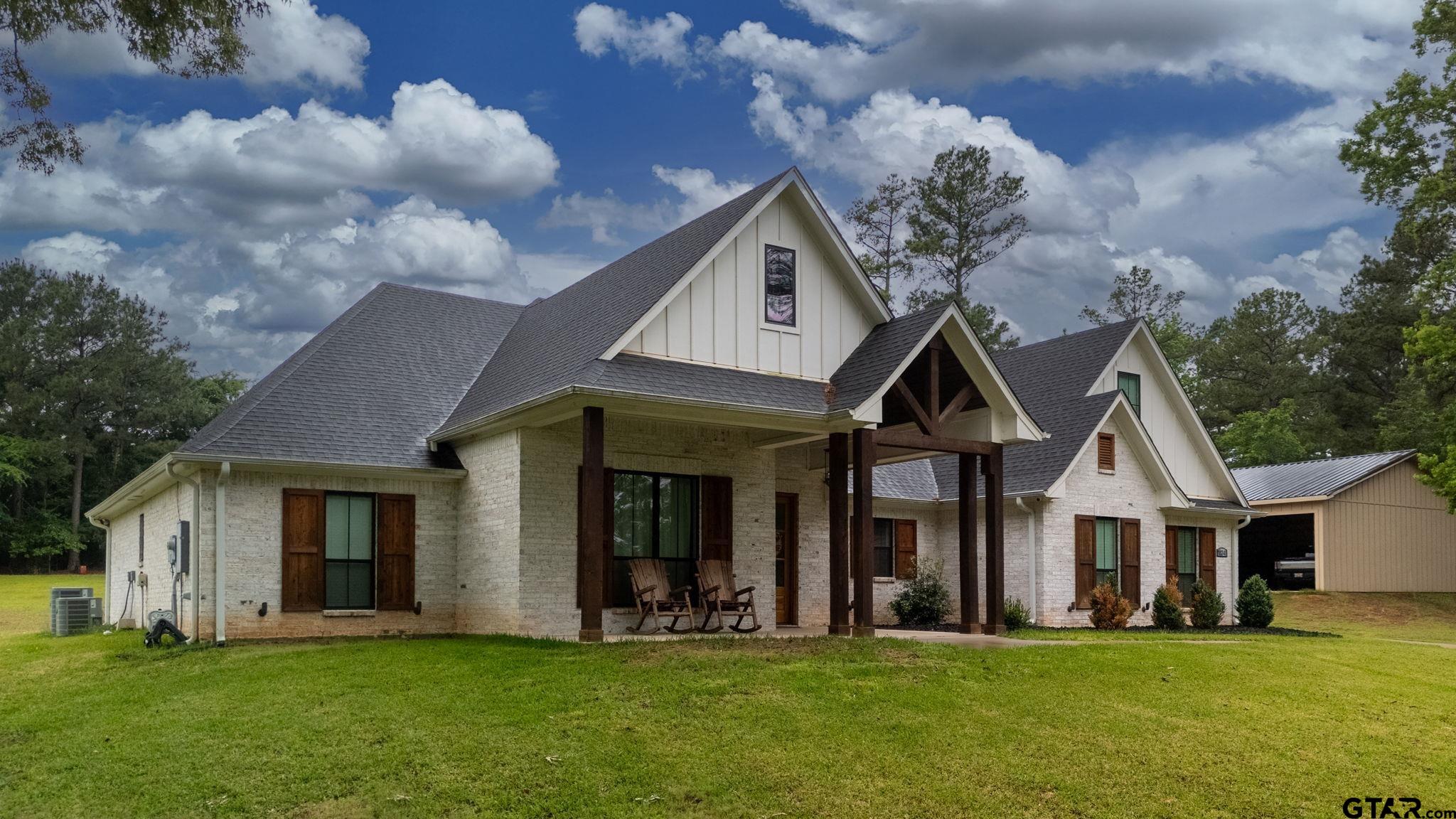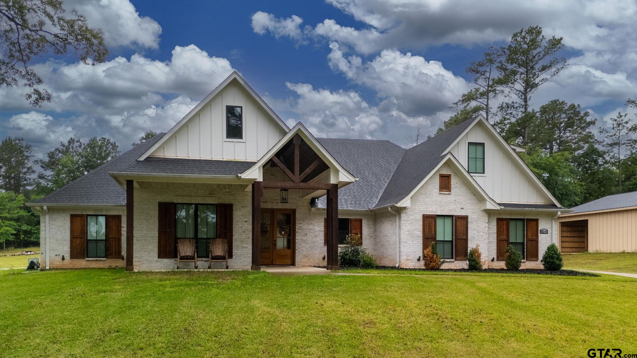 | Luxury Lake Life Living with 40x50 Shop! If you have been looking for a place with space, comfort, this one feels like home. Sitting on over 2 acres with a view of Lake Tyler East, this 4 bedroom, 3.5 bathroom home also includes a flexible bonus room that you can make your own - whether that is a home office, extra living room, classroom, craft room, the possibilities are endless. Inside, the open concept layout makes everything feel connected and easy. The living room, with brick fireplace, large windows, and built-ins, flows into a spacious dining room and kitchen, so it's great for everyday life or having people over. You'll also appreciate the oversized pantry- it just makes staying organized that much easier. Some kitchen features are custom cabinets, granite counter tops and farm sink. Primary bedroom is separate from the three guest bedrooms. Primary bedroom has a private en-suite bathroom attached. En-suite bathroom has separate vanities, shower with subway tiles and modern fixtures, separate tub, and walk-in closet. Step outside and you've got a covered front porch, great for rocking chairs, and a covered back patio with outdoor kitchen, giving you great spots to relax and enjoy the outdoors year-round. All you need to make this house a home is YOU! | |